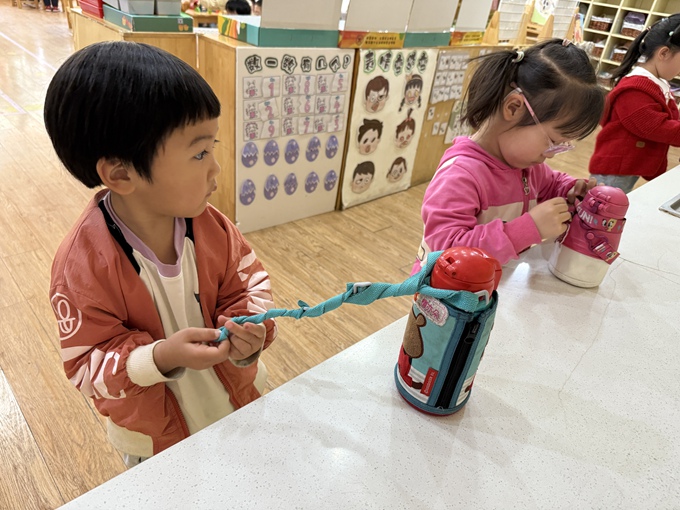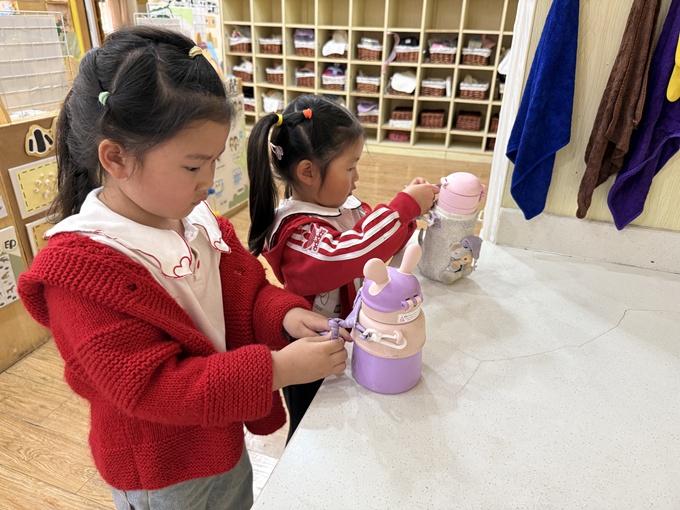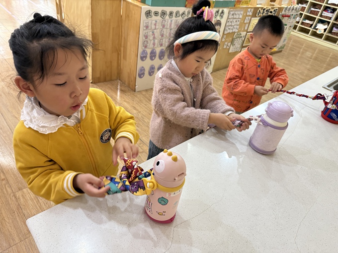 水杯带在我的手中转呀转,变成了麻花,穿过洞洞,看,我们杯子绕好啦!