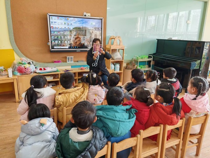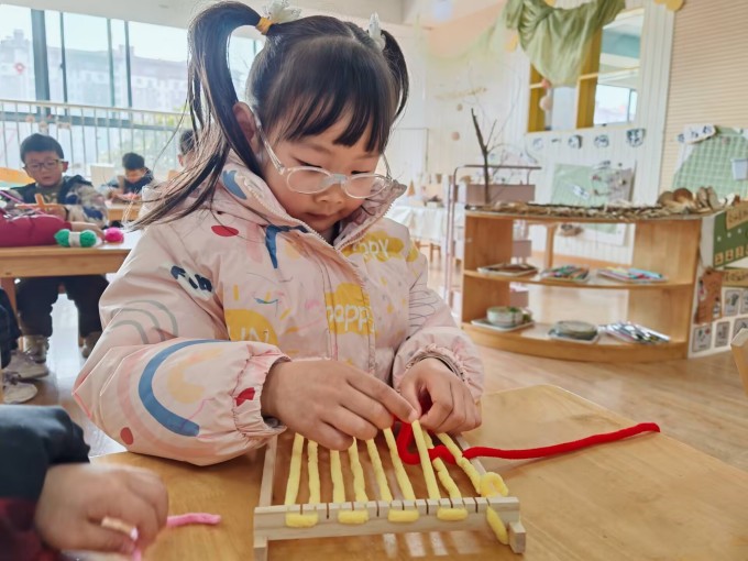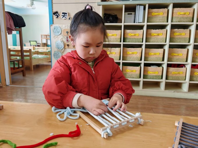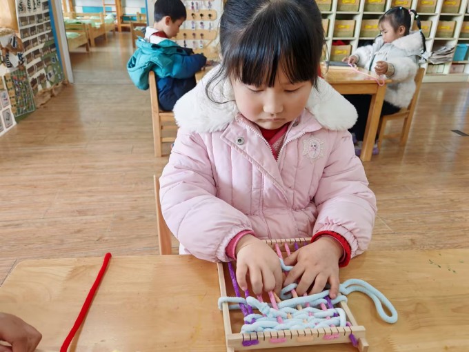 “猜一猜我们在干嘛呀?其实我们正在学习使用织布机呢!真好玩!”