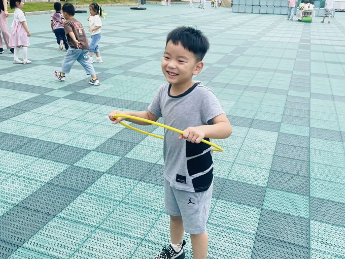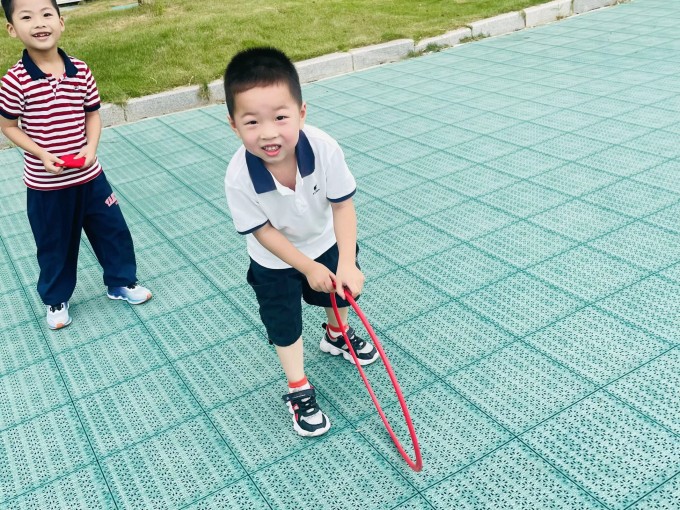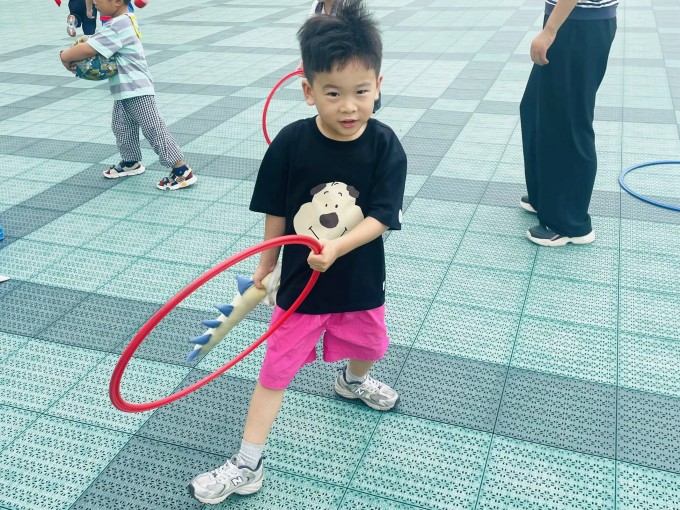 “圈圈可以怎么玩?当呼啦圈扭一扭、当轮胎滚一滚……都可以都好玩!”