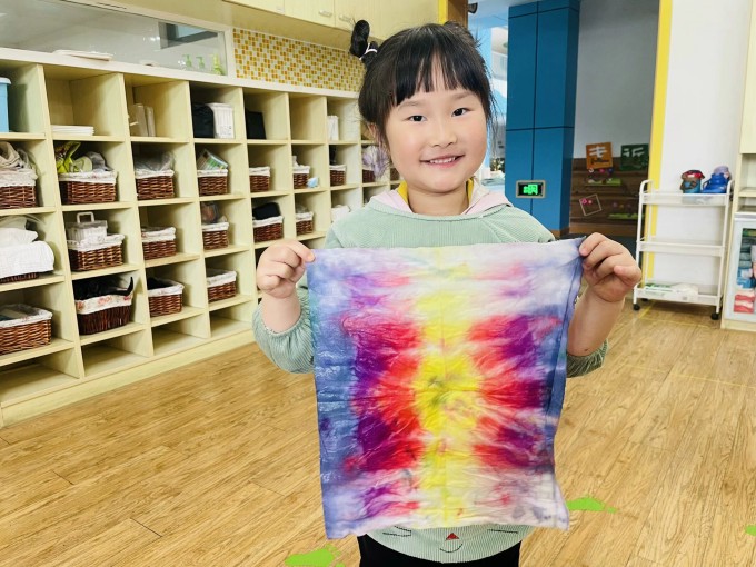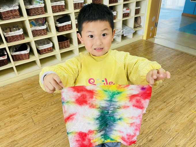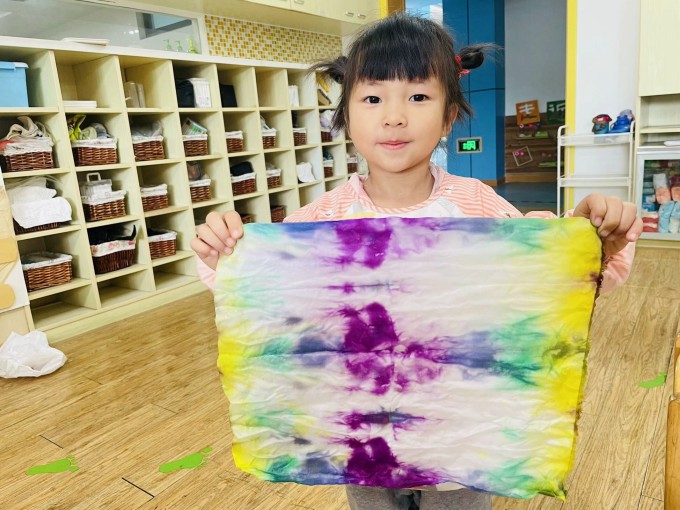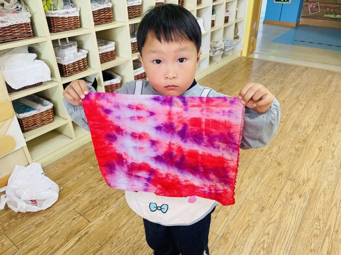 “我们今天做了一个有趣的实验,叫做扎染实验,你们觉得谁的作品最好看呢?”