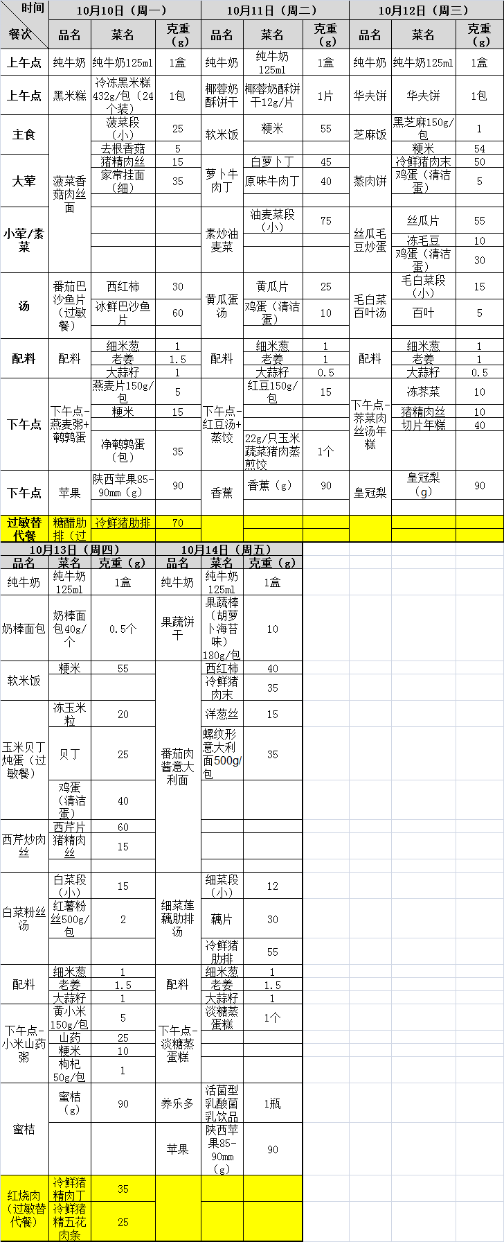 2022年秋学期第7周幼儿园食谱克重表(10月10日-10月14日)