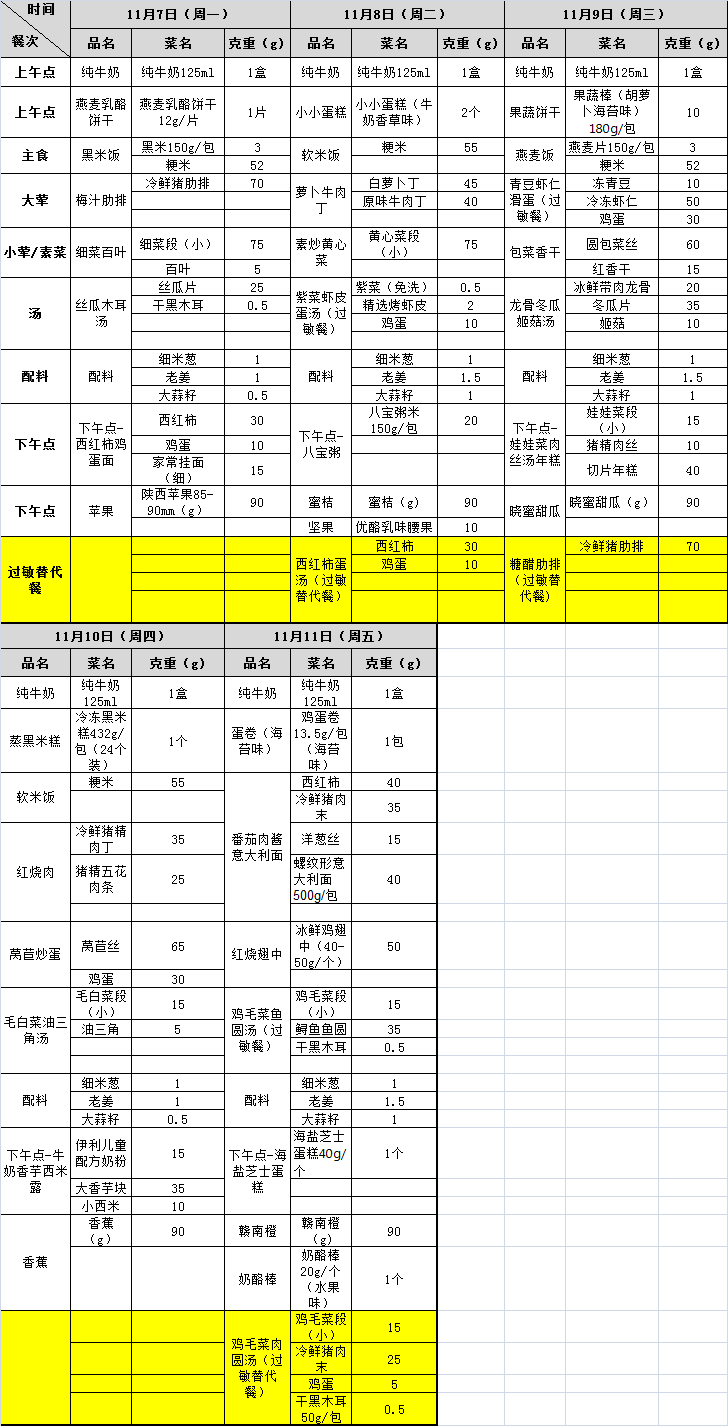 2022年秋学期第11周幼儿园食谱克重表(11月7日-11月11日)