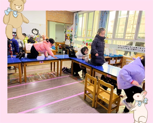 爬行活动、匍匐前进、钻山洞、蹦蹦跳。。。。。。游戏化、多样化的室内体育运动不仅能够满足孩子活泼好动的天性需要,也能增强孩子的身体机能、免疫力,培养幼儿对体育活动的兴趣,养成健康的学习生活方式。